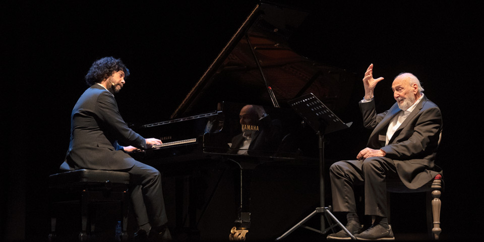 Casi cómo un cómplice, en este viaje a la memoria, lo acompaña musicalmente Juan Esteban Cuacci desde el piano, multiplicando la sensibilidad en la platea.