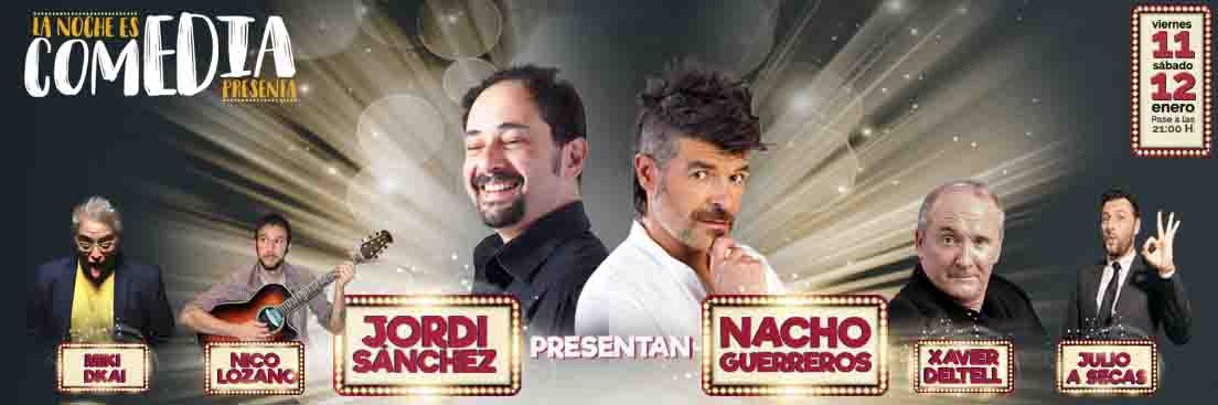 La noche es comedia es un espectáculo de monólogos, conducido por los actores Nacho Guerreros y Jordi Sánchez enlazando las apariciones de Miki Dkai, Xavier Deltell, Nico Lozano y Julio A Secas con una serie de sketches cómicos donde el público disfrutará en vivo de los dos actores con más carisma de la conocida serie “La que se avecina”.